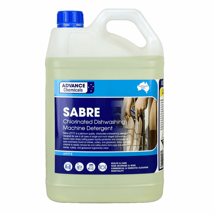 Chlorinated, caustic dishwashing machine detergent. Designed for economical use in a commerical kitchen setting. DIRECTIONS FOR USE SABRE LC777 should be added to the dishwasher by an automatic dispenser. Dosage rate is 1 – 3 ml/Lt of wash water. SABRE LC777 will provide excellent results and economy when used within these guidelines. To achieve optimum results, it is recommended that RINSE AID LN102 is added to the rinse stage of the dishwashing cycle.