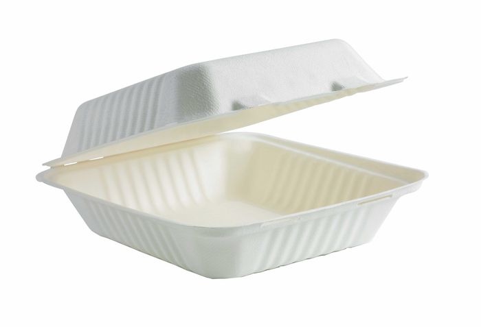 Our plastic-free clamshells are made from rapidly renewable sugarcane pulp, a by-product of the sugar refining industry. Our 7.8x8x3" white bagasse clamshell containers are made with no added PFAS, pending home compostable certification to AS5810 standards.
